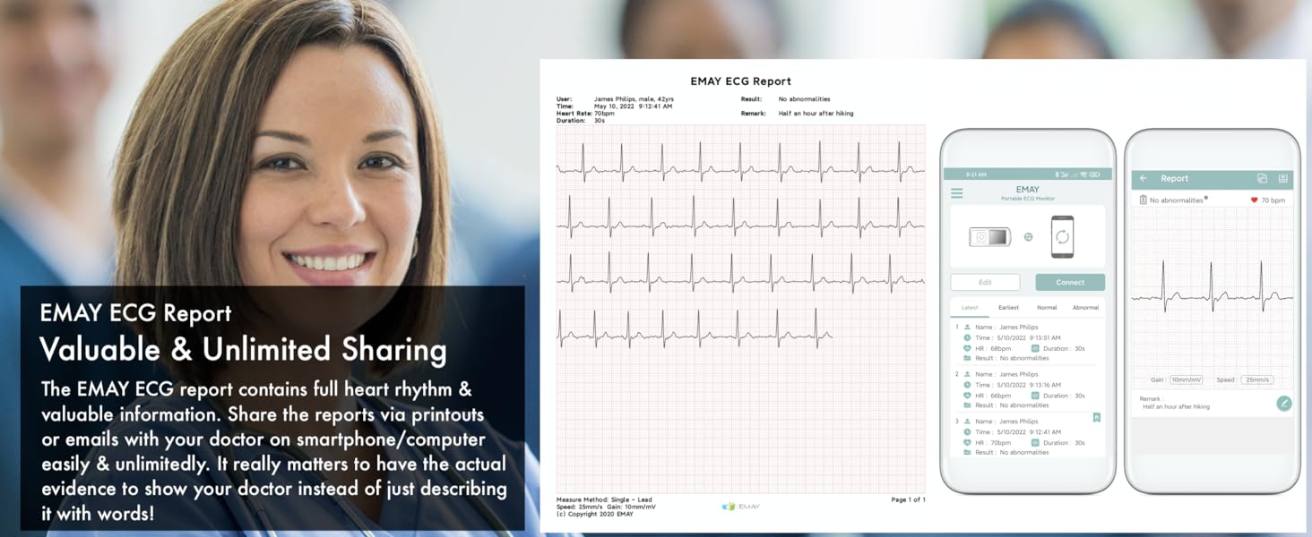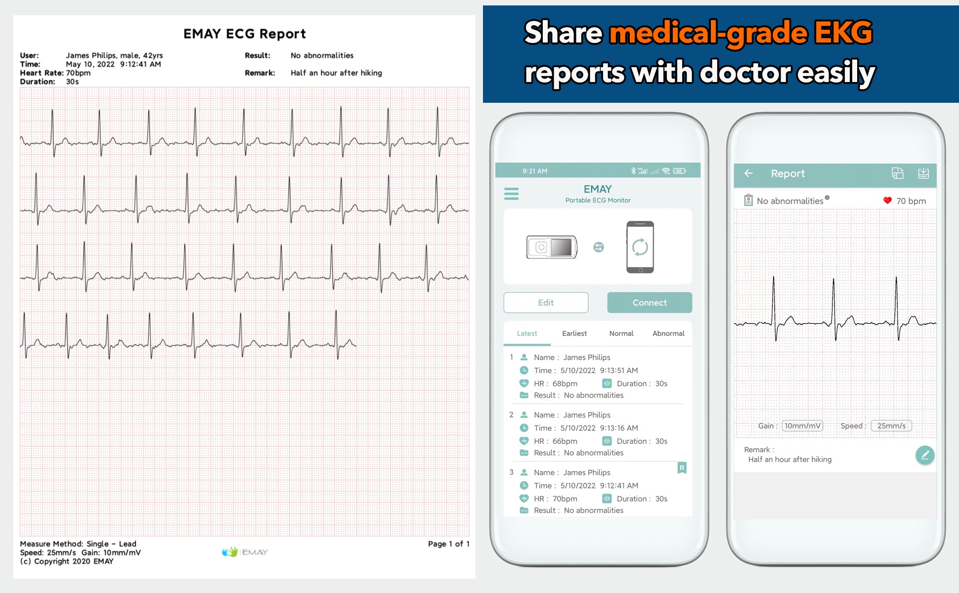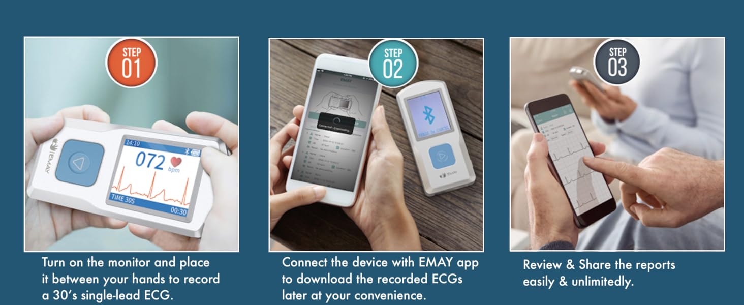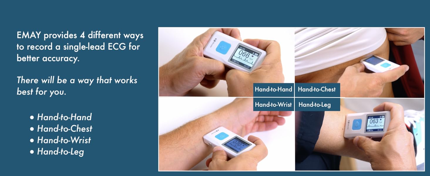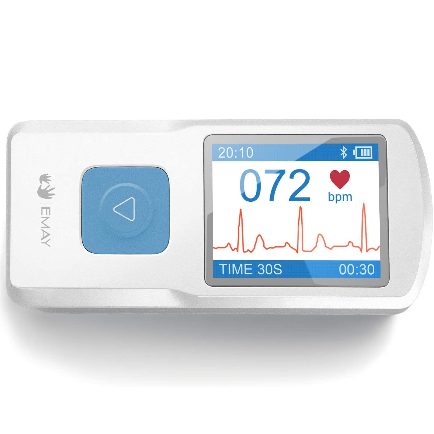 EMAY Portable ECG Monitor is a standalone single-lead ECG recording device with screen and storage for personal use. You don’t need a smartphone to make it work ! It allows you to record and view your real-time ECG rhythm on the device itself, and gives you important information in just 30 seconds.