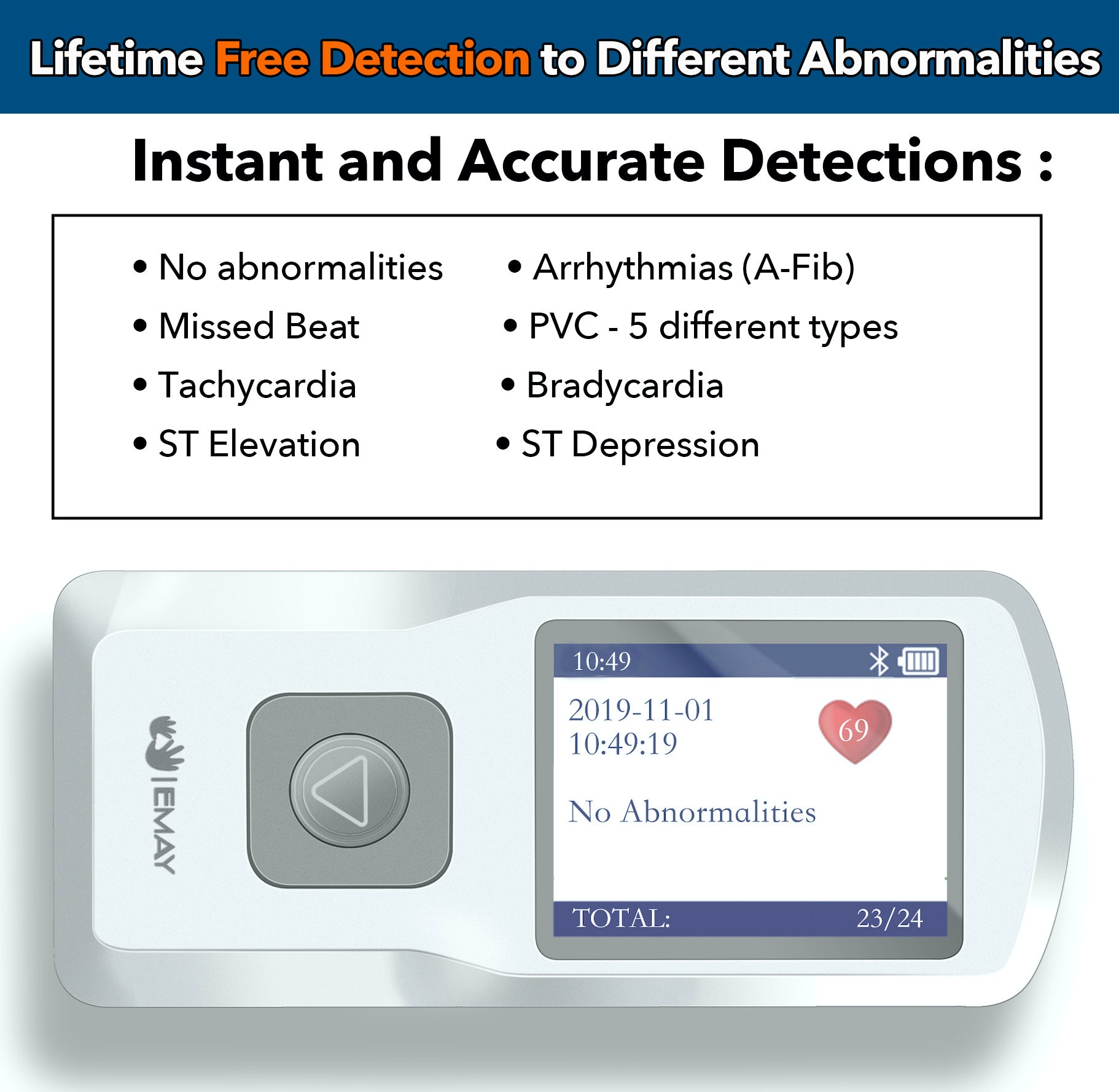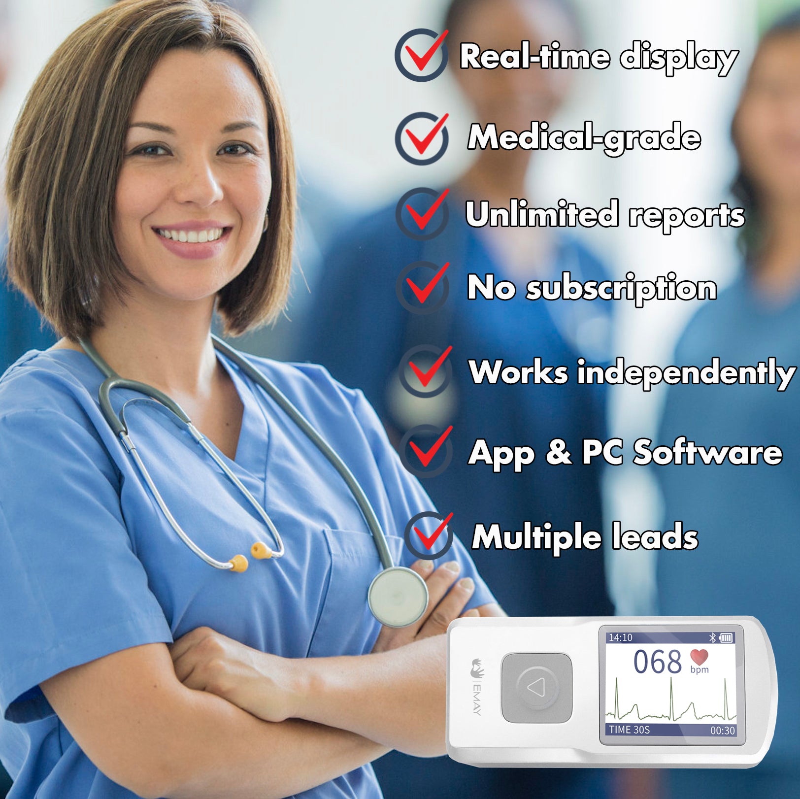 EMAY Portable ECG Monitor is a standalone single-lead ECG recording device with screen and storage for personal use. You don’t need a smartphone to make it work ! It allows you to record and view your real-time ECG rhythm on the device itself, and gives you important information in just 30 seconds.