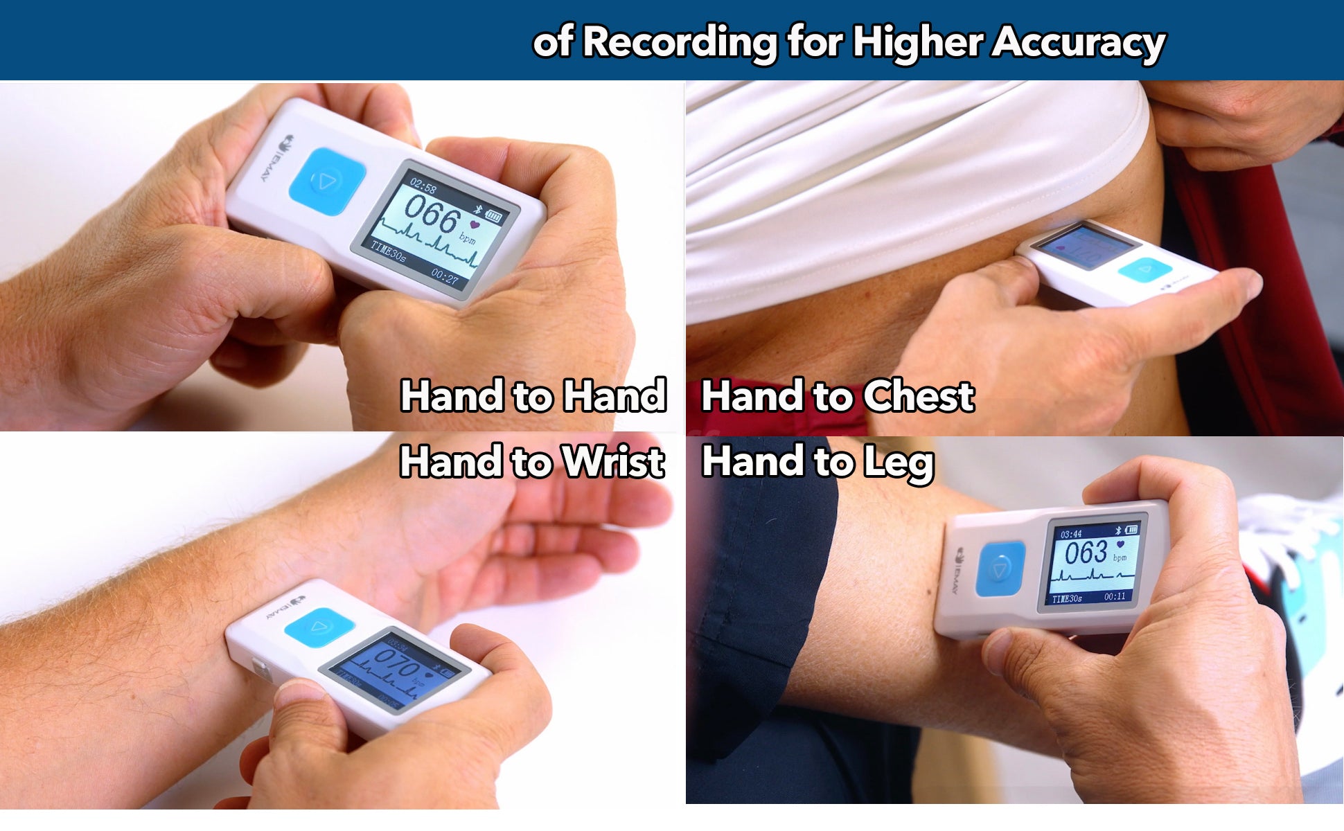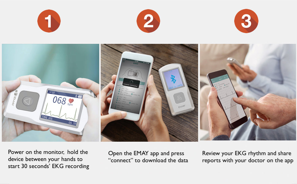 EMAY Portable ECG Monitor is designed for standalone use, it records and stores without requiring a smartphone. Simply turn on the monitor and apply your hands on the electrodes, it will then do the job!
