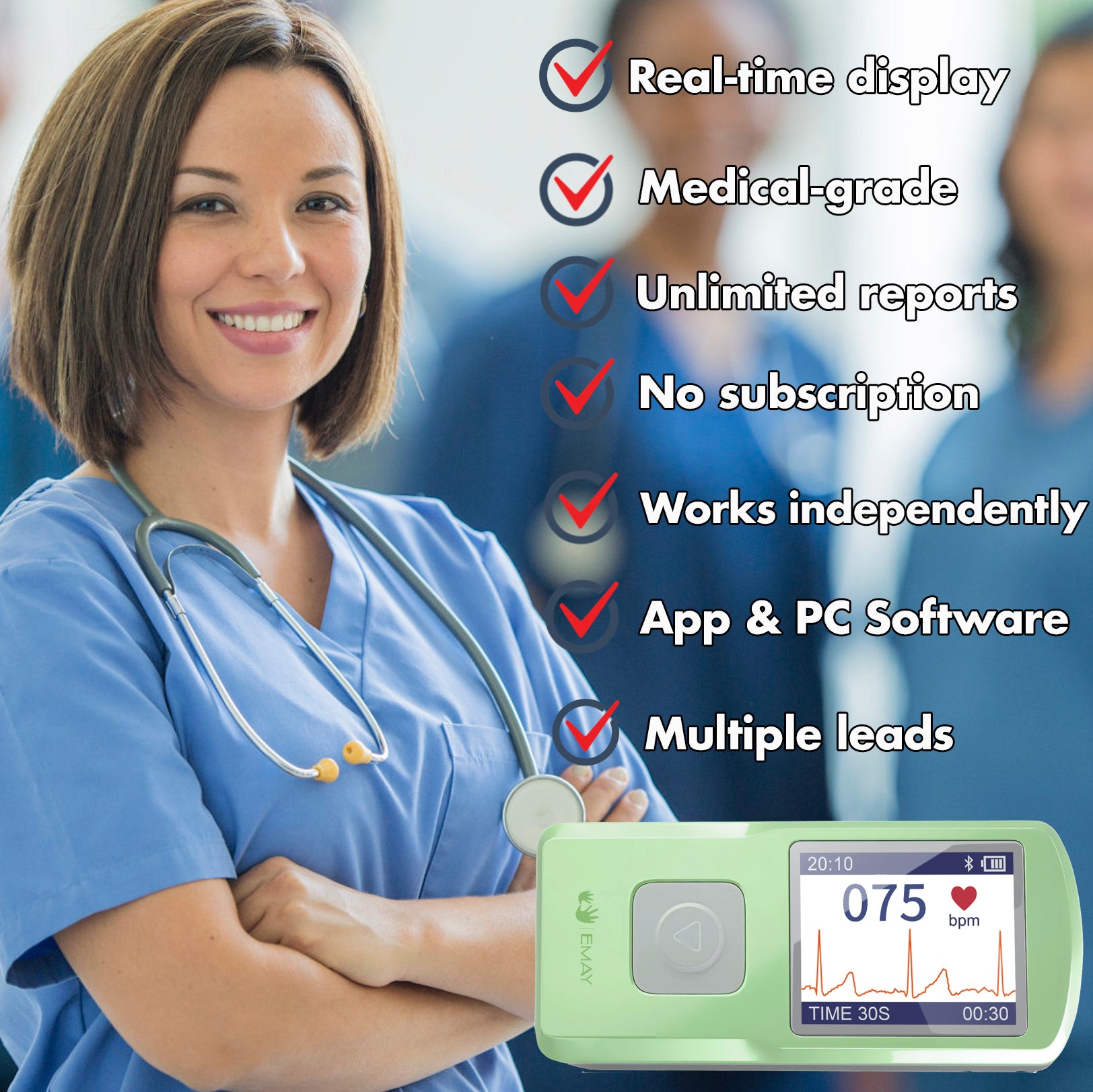 EMAY Portable ECG Monitor is a standalone single-lead ECG recording device with screen and storage for personal use. You don’t need a smartphone to make it work ! It allows you to record and view your real-time ECG rhythm on the device itself, and gives you important information in just 30 seconds.